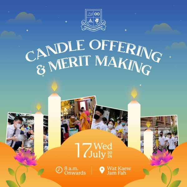 Panyarat High School will be celebrating the Buddhist Pannsa Lent on Wednesday July 17, 2024. The Matthayom 4 students and 10 members of student council will be parading the Pannsa Candle through the Wat Khaek market and then be merit making at Wat Kaew Jam Fa Temple. They will return to school at 10:30 a.m. and be studying for period 3.